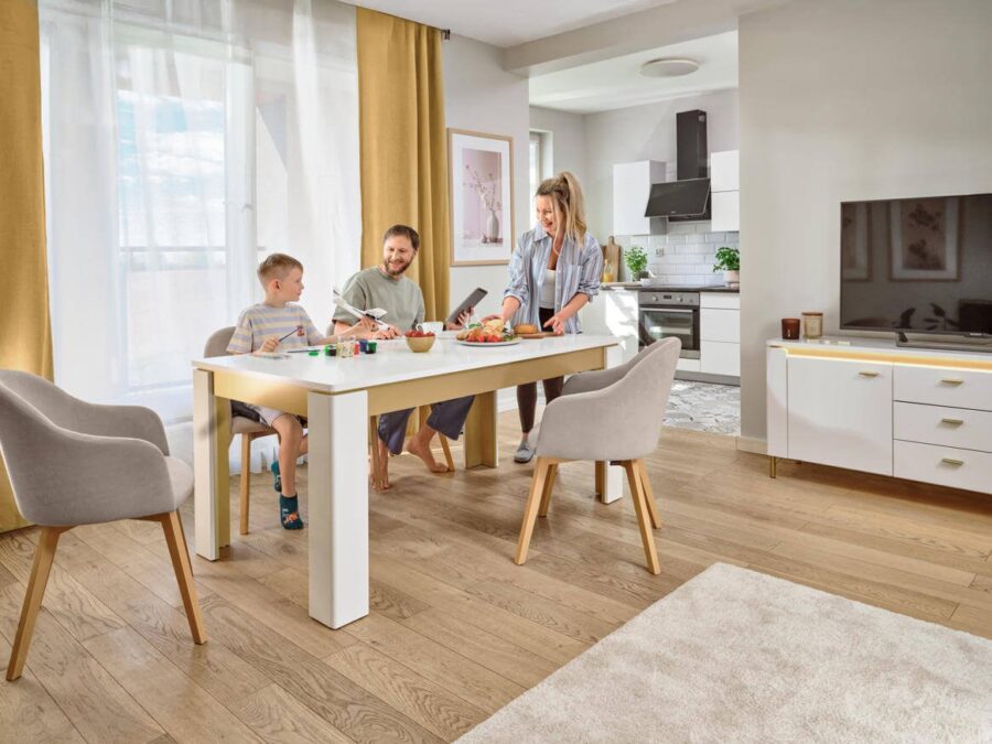 Nowoczesna jadalnia to nie tylko miejsce do jedzenia. To przestrzeń, w której toczy się codzienne życie – poranna kawa, praca z laptopem, odrabianie lekcji, rodzinne obiady i wieczorne rozmowy.