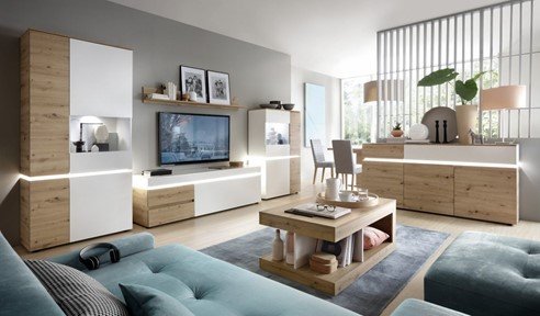 Meble do pokoju dziennego z szafą powinny być dostosowane do stylu, w jakim urządzone jest wnętrze i powinny idealnie się w niego wpisywać. Zgranie koloru mebli z kolorem ścian pozwoli uniknąć wrażenia przeładowania w pokoju dziennym. W niewielkich wnętrzach warto postawić na jasne barwy frontów i korpusów. Dzięki temu kolory te będą odbijać światło, a tym samym wizualnie powiększą przestrzeń. Bardzo dobrym wyborem będą szafy z lustrem (kolekcja Linate, TYP 23, SZAFA 4D), które także będzie odbijało światło, a tym samym dawało ten sam efekt. Bez względu na wielkość pomieszczenia, najczęściej wybierane są białe meble, które dają wrażenie lekkości. Aby wnętrze nie było monotonne, warto zdecydować się na mebel z ciemniejszymi dodatkami, które będą świetnie kontrastować i eksponować ciepły dekor drewna.