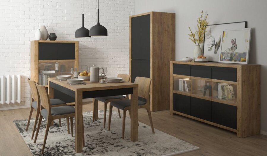 Odwrotne proporcje kolorystyczne warto zastosować w przestrzeni o bardziej nowoczesnym lub industrialnym charakterze. Uzupełnieniem całej aranżacji będą przeszklone komody i witryny z dodatkową funkcją podświetlenia w których np. wyeksponujemy kolekcję zastawy stołowej.