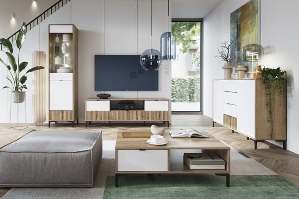 Z kolei w jadalni sąsiadującej z salonem warto zaznaczyć granicę pomiędzy strefami. Nie muszą to być żadne fizyczne bariery – wystarczy dobrze dobrany mebel. Komoda ustawiona równolegle do stołu lub otwarty regał to prosty sposób, by uporządkować przestrzeń bez zamykania jej. W takich aranżacjach dobrze sprawdzają się meble z kolekcji Cortina lub Toledo, które dzięki wyrazistym bryłom potrafią naturalnie wyznaczyć układ wnętrza.