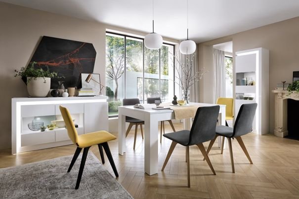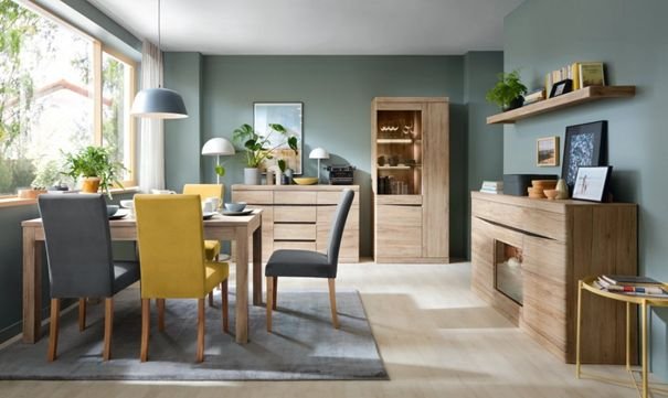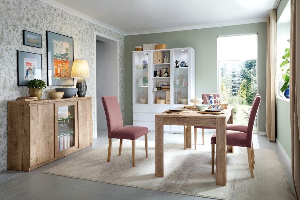 W nowoczesnych aranżacjach, nie tylko jadalni, ale też całych stref dziennych, dominuje prostota – nie zimna i surowa, ale przyjazna, jasna i uporządkowana. Czyste linie, lekkie konstrukcje, ciepłe barwy i meble, które dobrze wpisują się w przestrzeń to kierunek, który zyskał dużą popularność. W takiej roli świetnie odnajdują się elementy kolekcji Fribo, wyróżniające się pięknym drewnianym dekorem. Ich uniwersalny charakter sprawia, że pasują zarówno do otwartych, wielofunkcyjnych pomieszczeń, jak i do mniejszych, bardziej intymnych jadalni.