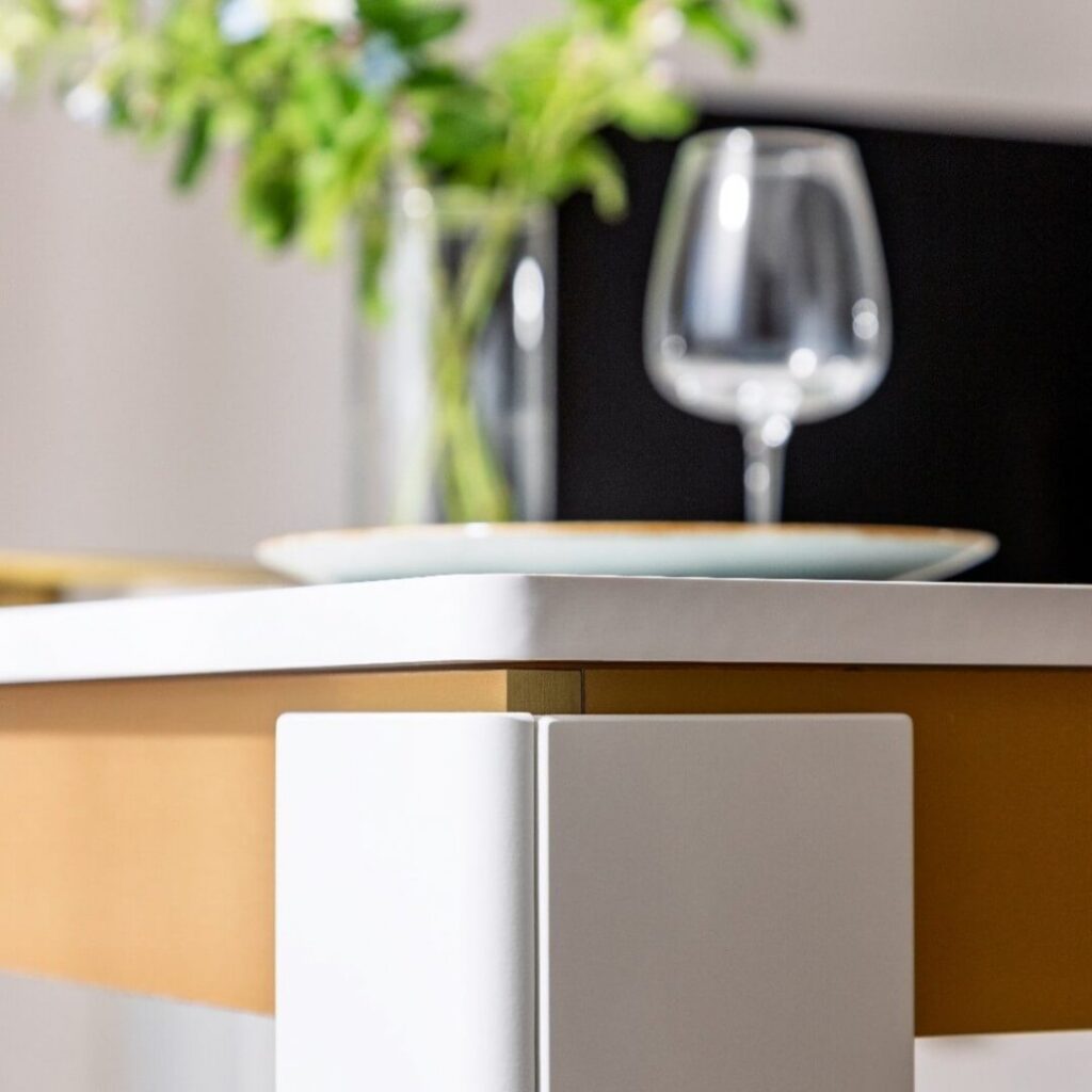 Wysokość stołu powinna mieścić się w standardowym zakresie 74–76 cm, np. stół z kolekcji Lazio – elegancki model łączący biel z dodatkami w kolorze złota. Stół ma praktyczną, rozkładaną opcję z prowadnicą synchroniczną. Dzięki temu, gdy wysuwamy blat z jednej strony, mechanizm automatycznie wysuwa go z drugiej strony. Jest lekko, równo i bez wysiłku. Jeśli chodzi o krzesła, warto wybierać modele z wyprofilowanym oparciem i odpowiednio głębokim siedziskiem, które zapewnią wygodę zarówno podczas szybkiego śniadania, ale też dłuższego spotkania przy kolacji. Jeśli zależy Ci na utrzymaniu porządku, rozważ krzesła łatwe w czyszczeniu – z obiciem z tkaniny hydrofobowej lub tworzywa, które bez trudu da się przetrzeć wilgotną ściereczką.