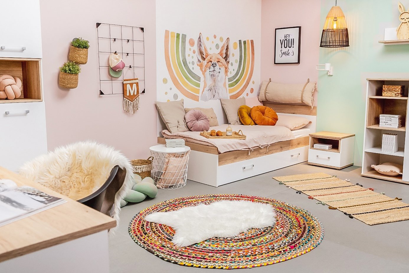 Dziecięcego uroku i przytulności wnętrzu dodadzą koce z naturalnych tkanin, miękkie poduszki, wiklinowe dodatki czy plecione dywany. Tych elementów dekoracyjnych nie powinno zabraknąć. I to wcale nie ze względu na obowiązujące trendy, ale z uwagi na ich uspokajający i wyciszający charakter. A jak wiadomo każde dziecko lubi się wyszaleć. Pokój ten zatem powinien umożliwiać zarówno rozrywkę, jak i odpoczynek po różnego rodzaju aktywnościach tych w i poza domem.