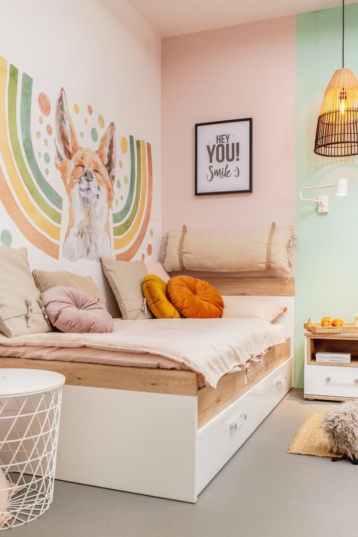 Wiadomo, pokój najmłodszego członka rodziny musi być funkcjonalny, ale też ładny i radosny. Decydując się na kolor ścian sięgaj po stonowane pastele, aby nie rozpraszały dziecka i pozwoliły mu się wyciszyć. Poza tym, łagodne barwy dają większe możliwości aranżacyjne – nawet jeśli kontrastują. Tak jak u Jagody, która piękny pastelowy róż połączyła z zielenią. Z białymi meblami w tle wyglądają pięknie.