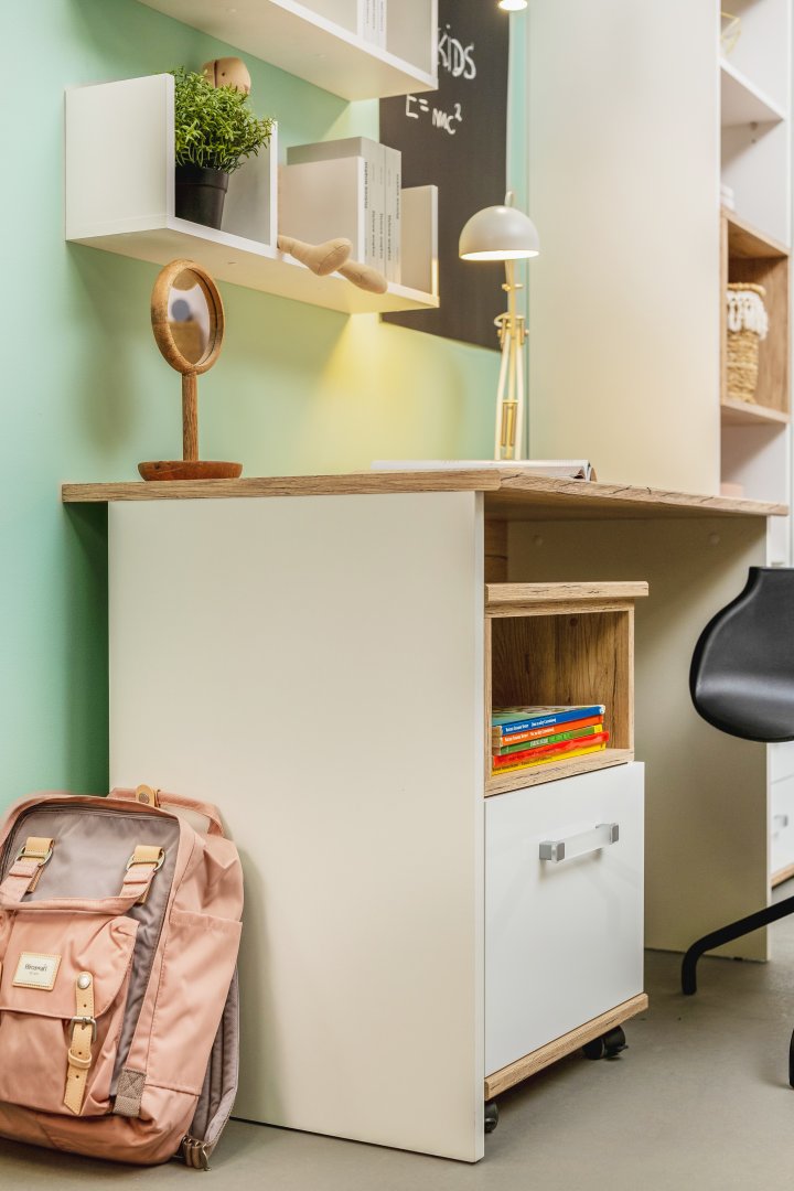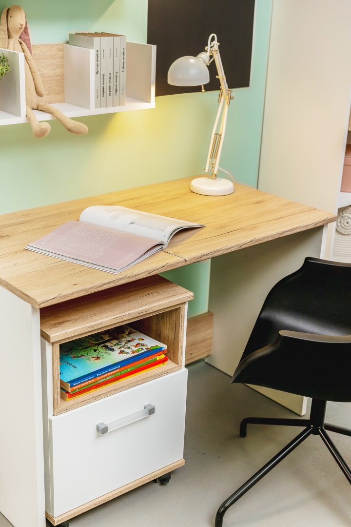 Biurko – niezbędny element wyposażenia, aby dziecko mogło wygodnie i spokojnie odrabiać lekcje, rysować, malować czy lepić figurki z plasteliny. Ważne jest, aby było dopasowane do wieku, wzrostu i jego potrzeb. Jagoda wybrała proste, minimalistyczne biurko z mobilnym kontenerkiem do przechowywania zeszytów czy bloków, który swobodnie zmieści się pod blatem, a równocześnie może wędrować po pokoju wraz z dzieckiem. Co ważne – nie rysując przy tym podłogi.
