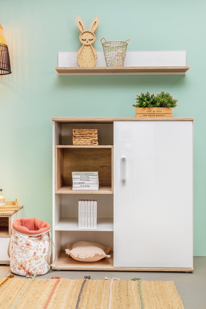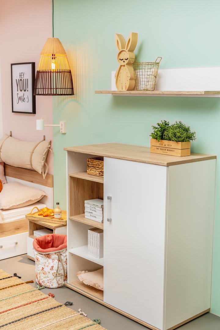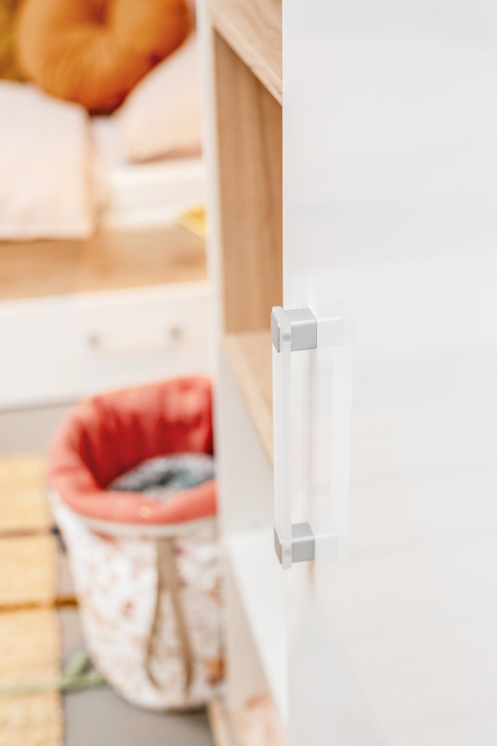 Nietypowym i sprytnym rozwiązaniem jest komoda z funkcją szafy, której nie mogło zabraknąć we wnętrzu zaprojektowanym przez Jagodę. Na pewno docenią ją dzieci, które lubią samodzielnie wybierać ubrania. Cechą charakterystyczną tego mebla są przesuwne drzwiczki, łatwe w użytkowaniu nawet dla najmłodszych, które na pewno sprawią im frajdę. Wszystkie wieszaczki mają wyciągnięcie ręki. Komoda wyposażona jest w cztery półki i jeden charakterystyczny box, a na jej blacie możemy pięknie wyeksponować dziecięce zabawki.