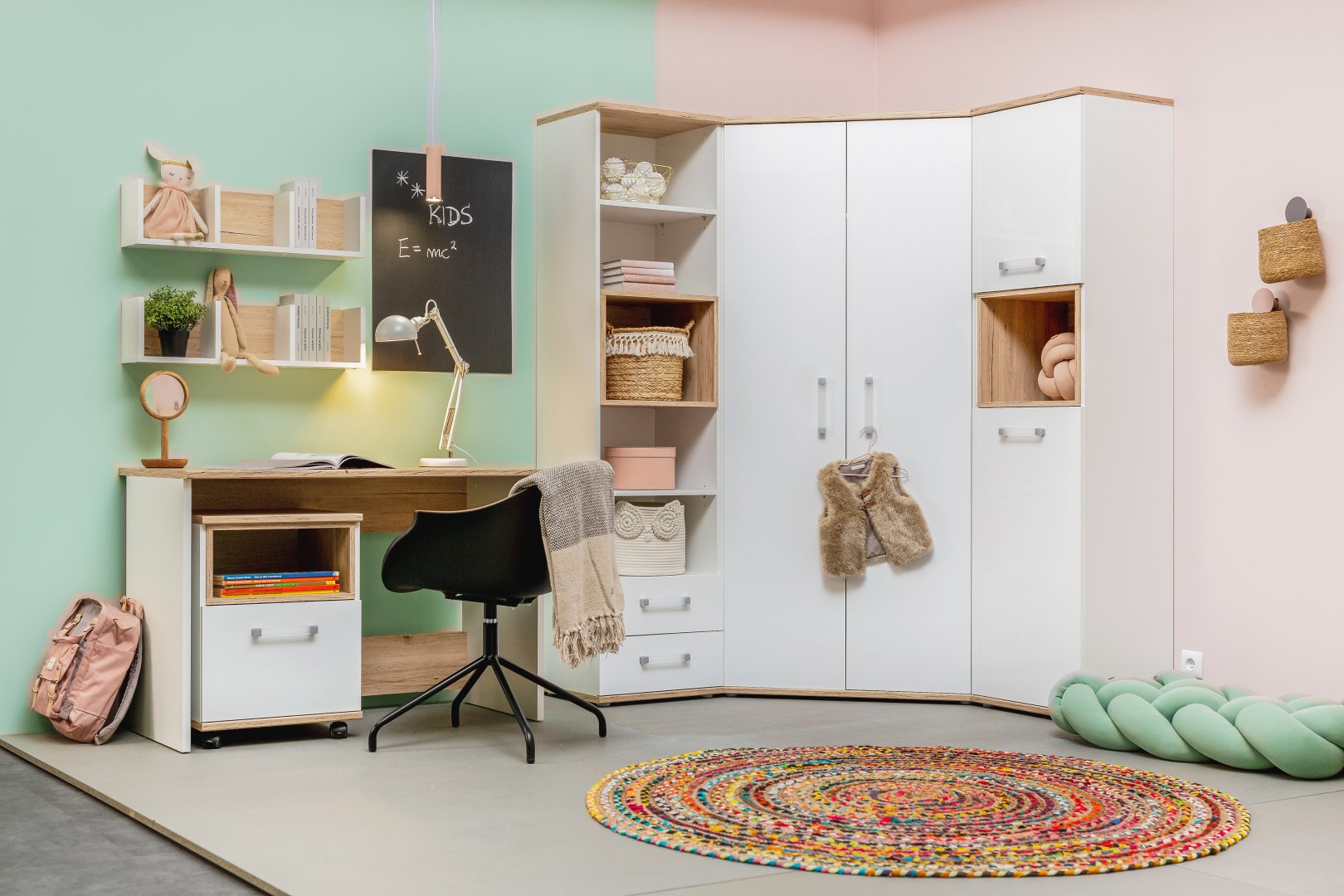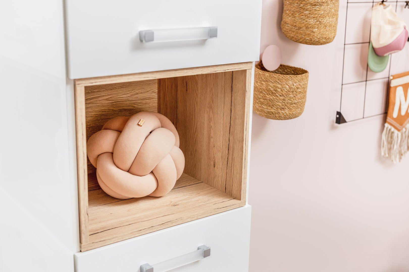 To jeden z kluczowych punktów programu. Jak pomieścić wszystkie ubrania i cały dobytek zgromadzony przez Twojego malucha, pamiętając jednocześnie o jego komforcie i bezpieczeństwie? Znajdź miejsce na pojemną szafę. Jagoda wybrała narożną wersję, ponieważ pasuje do każdego kąta. Uzupełniła ją o dodatkową bieliźniarkę, przez co zyskała dodatkowe miejsce do przechowywania oraz regał z półkami, na których jest mnóstwo miejsca na książki czy pudełka z dziecięcymi niezbędnikami. Wszystkie trzy bryły tworzą stylową całość, nie zajmując przy tym nadmiernej ilości miejsca.