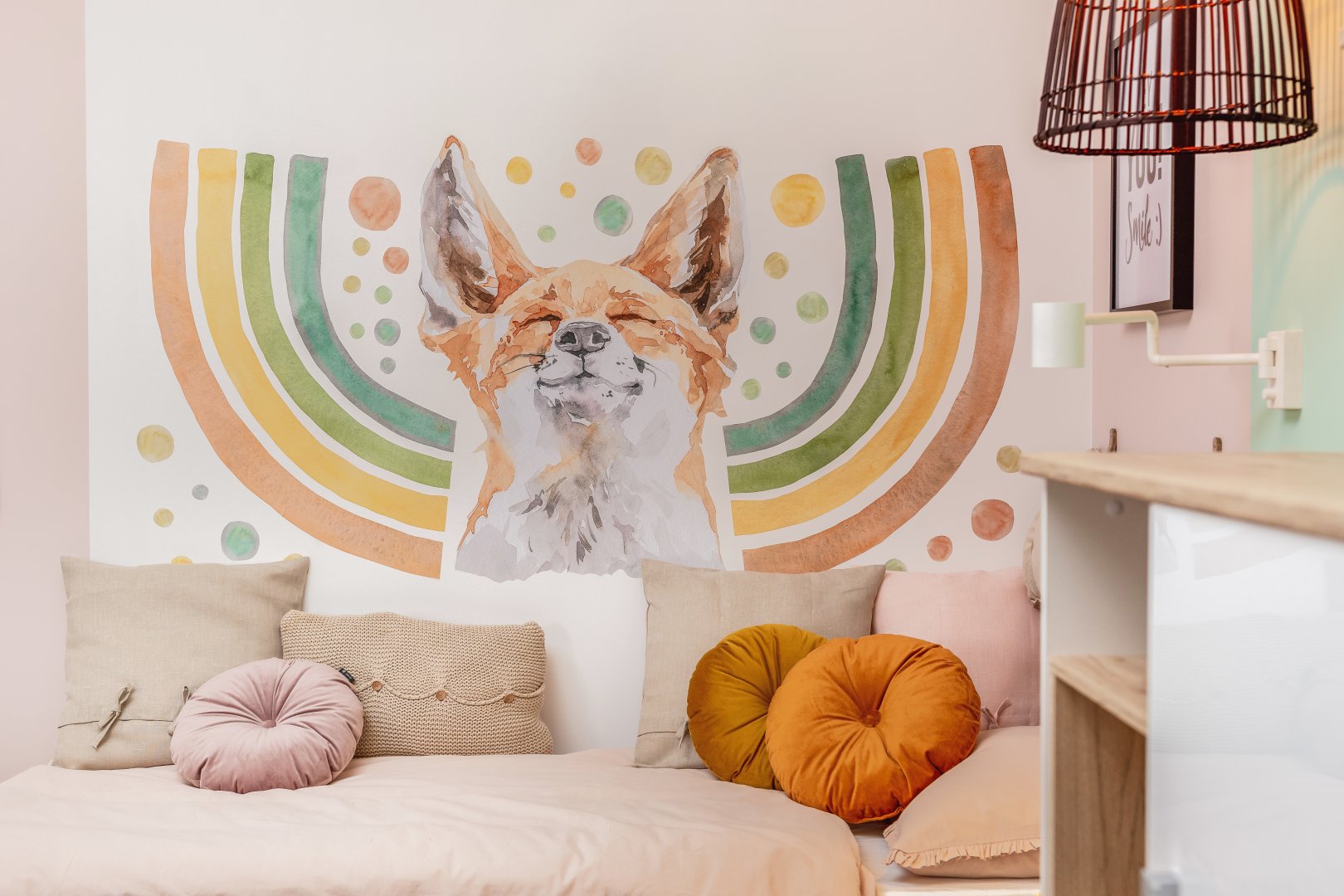 Nie zapomnij też o motywie przewodnim, np. dużej naklejce z ulubionym bohaterem czy zwierzakiem malucha. Nada wnętrzu stylu i niepowtarzalnego klimatu, a jeśli szybko się znudzi, zawsze możesz wymienić ją na inną, nie niszcząc przy tym ściany.