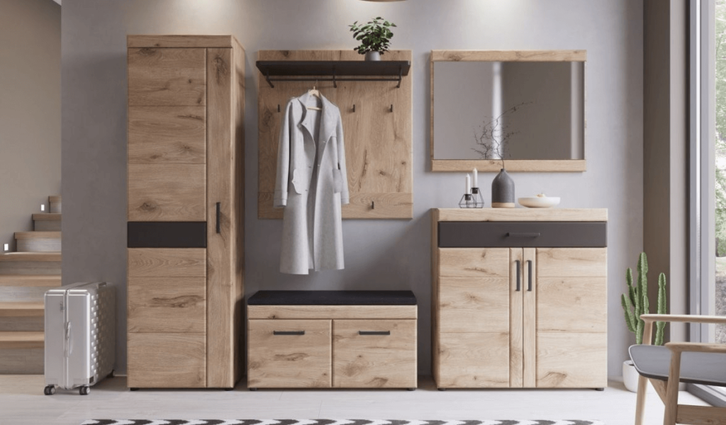 Podstawą wyposażenia przedpokoju jest oczywiście praktyczna szafka na buty. Warto rozważyć tutaj wybór mebla o naturalnym, ponadczasowym wykończeniu, np. w ciepłym odcieniu drewna, który ociepli przestrzeń. Szafki z serii mebli GRANO sprawdzą się tu idealnie – ich minimalistyczny design i subtelne wykończenie harmonizują z jesiennym klimatem, a przy tym są na tyle praktyczne, że pomieszczą różnorodne modele obuwia.