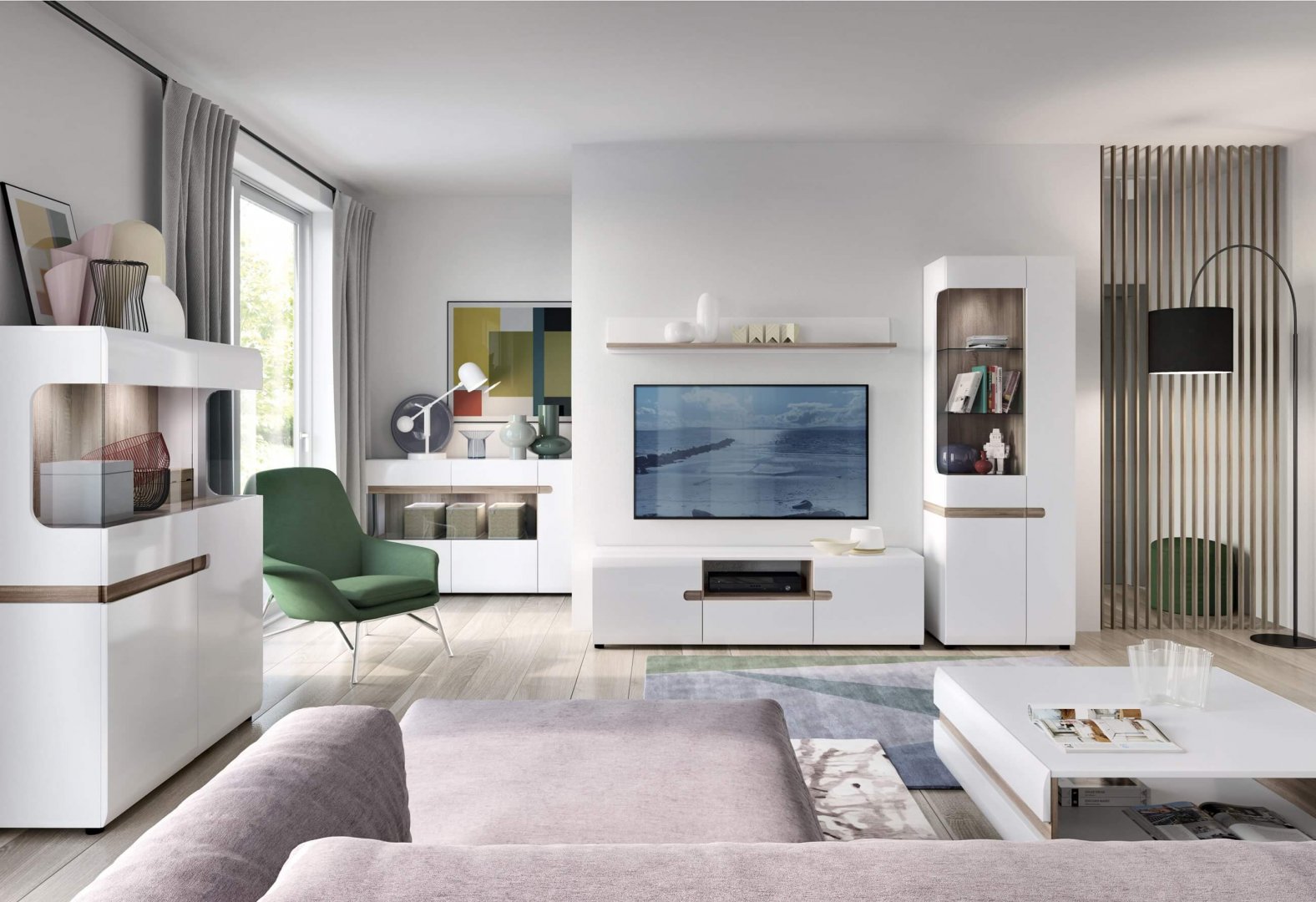 Kolekcja LINATE marki Meble Wójcik idealnie nadaje się do urządzenia jadalni. Poniżej można zobaczyć, jak wygląda ten pokój w domu Pani Hanny. LINATE to także meble do salonu. Alpejską Biel mebli idealnie podkreślają szare ściany i delikatne fioletowe akcenty (poduszki, świeczki).