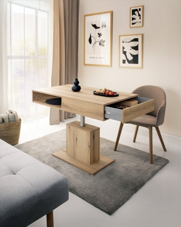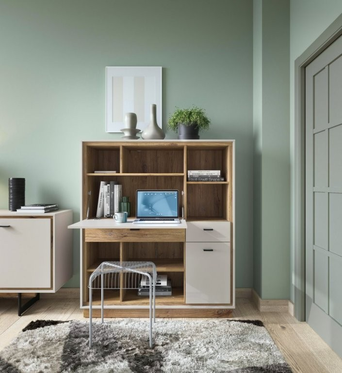 Meble wielofunkcyjne – meblem, który doskonale sprawdzi się w salonie, a w razie potrzeby zamieni się w wygodny kącik do pracy, jest regał z funkcją biurka z kolekcji Rivero. Ten innowacyjny mebel łączy funkcje regału i biurka, umożliwiając łatwe przekształcenie przestrzeni w zależności od potrzeb.