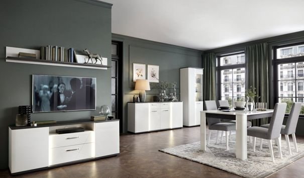 Zatem jeśli chodzi Wam po głowie wybór modnych kolorów mebli do nowoczesnego salonu, warto rozważyć kolekcję Lyon. Jej wyjątkową cechą jest podświetlenie. Ciepłe światło LED oświetla górne wieńce oraz boki poszczególnych witryn, oraz komód. Dzięki temu stwarza ono przytulny klimat, nadając uroku każdemu pokojowi dziennemu. Połączenie tych podświetlonych rozwiązań z kilkoma innymi elementami z tej oferty, tj.: