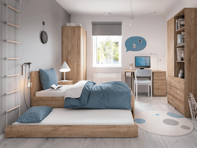 Mimo tych różnic postaraj się zachować spójną bazę aranżacji – pomocne mogą okazać się meble o neutralnej stylistyce, jak białe lub drewnopodobne bryły z kolekcji Fribo, które doskonale komponują się z różnymi kolorami ścian i dodatków. Dzięki temu pokój może „rosnąć” razem z dziećmi, bez konieczności częstych zmian w wystroju.