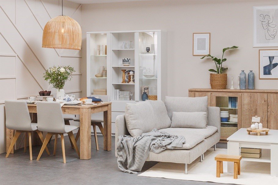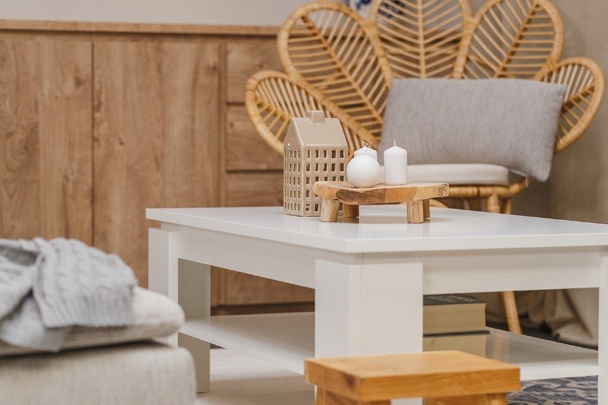 W tak niewielkim pomieszczeniu meble i dodatki w obu częściach powinny dobrze się ze sobą komponować. Karolina, projektując strefę dzienną, wybrała eleganckie i proste w formie meble z kolekcji Fribo, która daje duże możliwości aranżacyjne. W każdej z nich połączyła naprzemiennie dwa kolory, przełamując w ten sposób kolorystykę we wnętrzu. I tym sposobem w części jadalnianej – duży, funkcjonalny stół w kolorze drewna, doskonale zgrywa się z białym nietuzinkowym kredensem, który powstał poprzez zestawienie dwóch witryn i regału. W części jadalnianej mamy z kolei zestawienie białego kawowego stolika z piękną, funkcjonalną komodą w dekorze drewna. Zasada przeciwieństwa okazała się w tym wypadku strzałem w dziesiątkę.