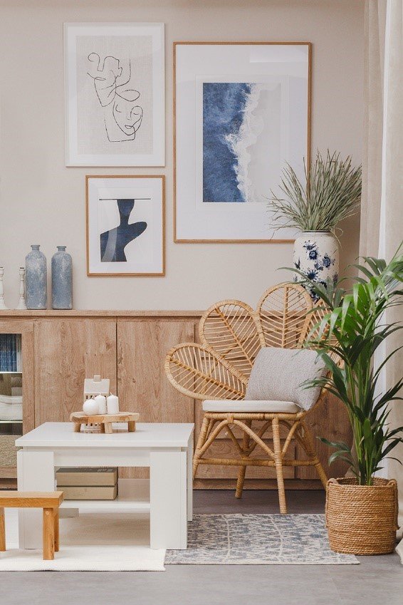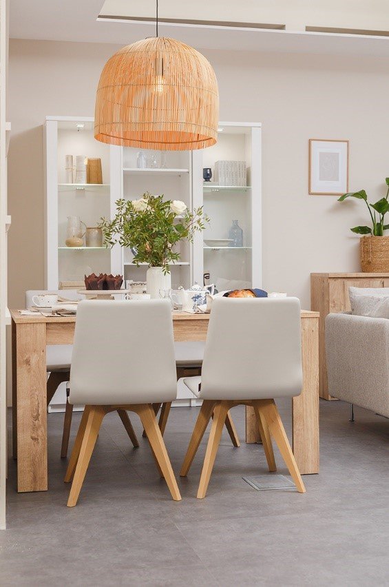 Aby ożywić wnętrze, a jednocześnie utrzymać w nim przytulną atmosferę, Karolina zagrała naturalnymi dodatkami. Mamy tu elementy skandynawskie, soft boho i hampton. Duży, zawieszony nad stołem bambusowy żyrandol, doskonale uzupełnia część jadalnianą. Wiklinowy, oryginalny fotel nadaje strefie relaksu charakteru, jednocześnie wyraźnie ją wyznaczając. Szara sofa, miękki jasny dywan czy beżowe zasłony, sprawiają, że przestrzeń stała się ciepła i zaprasza do spędzania w niej każdej wolnej chwili. Nie zabrakło też wyraźnych granatowych akcentów oraz zielonych roślin, które kontrastują z jasnymi, pastelowymi kolorami.