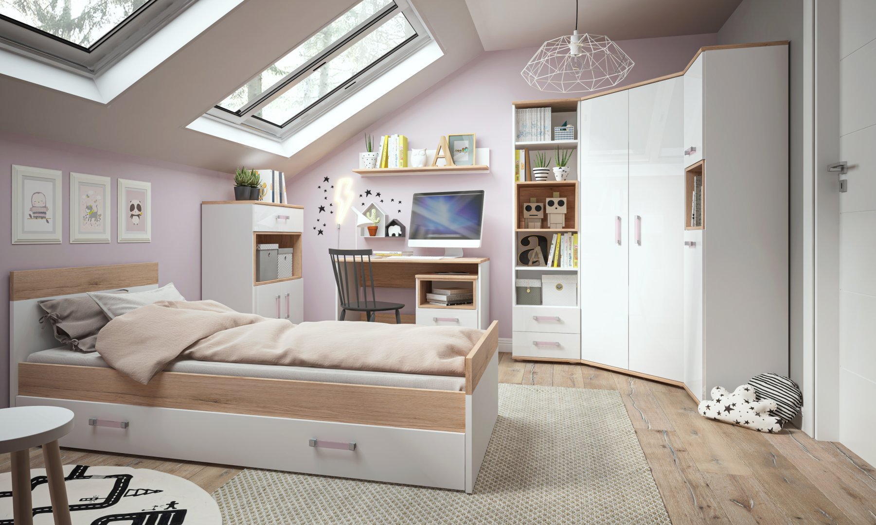 Jeśli planujesz wymienić wszystkie meble w pokoju dorastającego dziecka, postaw na jedną kolekcję. Zapewnisz wnętrzu spójność aranżacyjną, a jednolita baza pozwoli grać dodatkami oraz kolorami. Pełen zestaw umożliwi swobodniejszą aranżację przestrzeni w zależności od preferencji nastolatka czy potrzeby wprowadzenia zmian, gdy pokój będzie wymagał odświeżenia lub po prostu mu się opatrzy. Jeśli zależy Ci tylko na zapewnieniu dodatkowego miejsca do przechowywania i masz wolną przestrzeń w kącie pokoju, szafa narożna będzie doskonałym wyborem. Dobierając bryłę do pozostałych mebli postaraj się, aby jej kształt i dekor dobrze komponowały się z aranżacją całego pomieszczenia. Pamiętaj, że spójne, harmonijne wnętrze przekłada się na samopoczucie oraz komfort jego mieszkańca i sprawi, że chętniej będzie spędzał w nim czas. Dla nastolatków, własna domowa przestrzeń, w której mogą zaszyć się na pół dnia, jest niezwykle ważna.