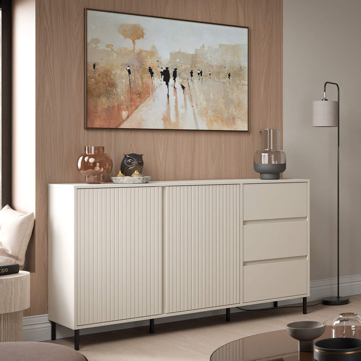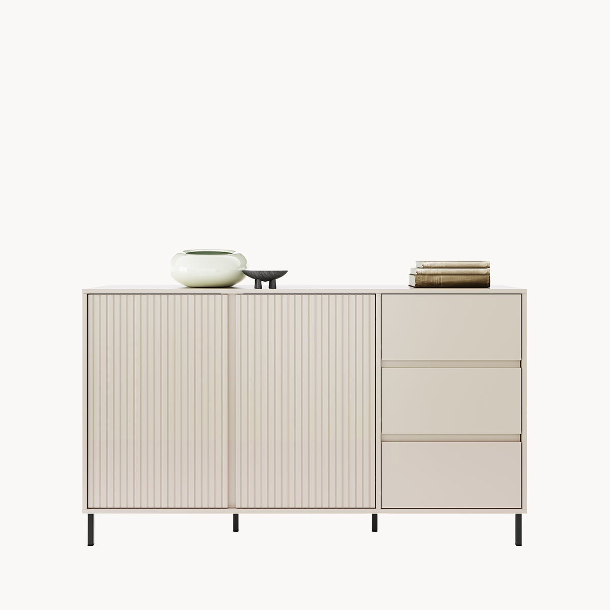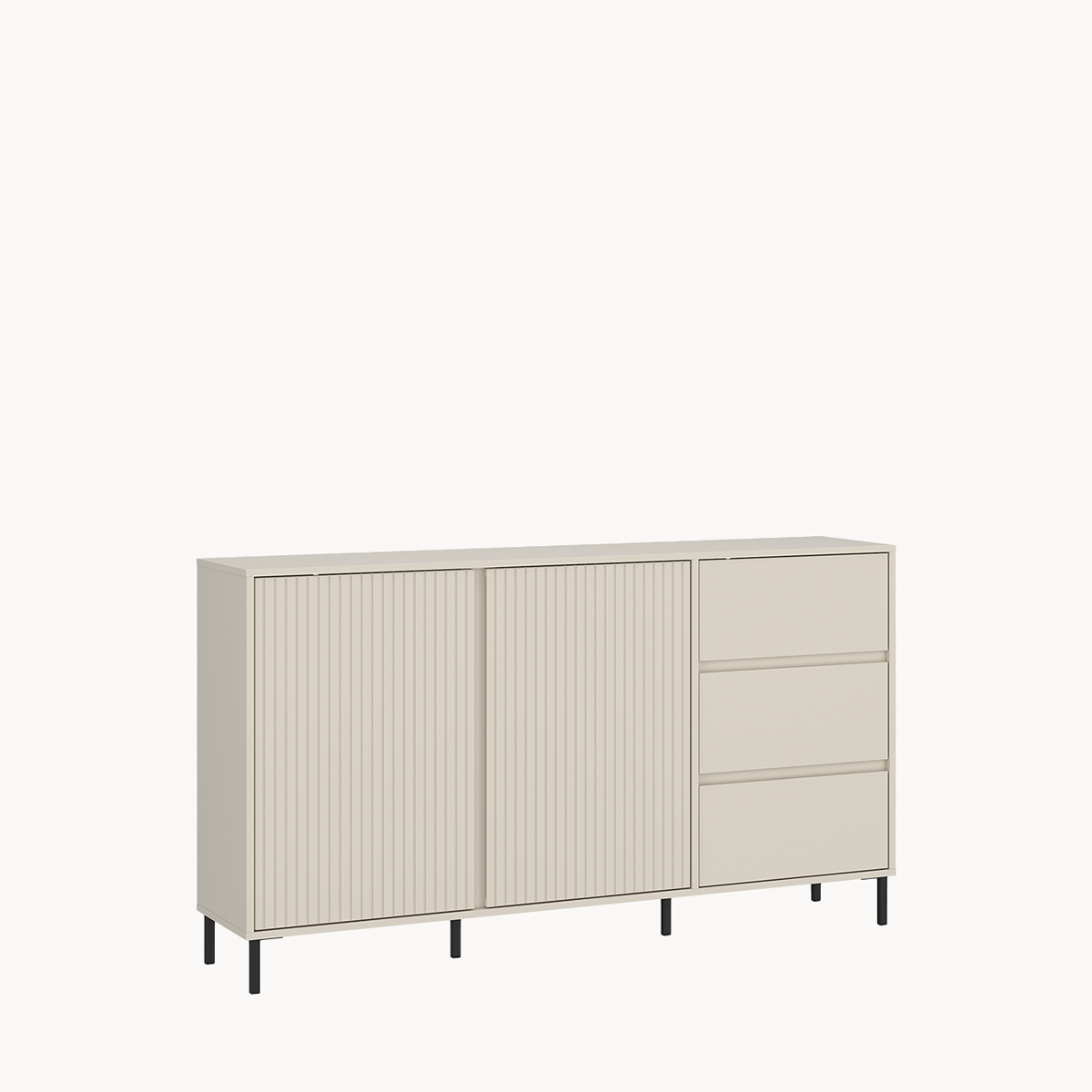 Kolekcja AVENALE to pięć komód, których wspólnym wyróżnikiem są pionowo ryflowane fronty i smukłe metalowe nóżki w kontrastowej czerni. Różne szerokości brył pozwalają swobodnie zestawiać meble w osobiste konfiguracje – od pojedynczego akcentu w pierwszym mieszkaniu po rozbudowany komplet w przestronnym salonie. Model AVEK01 (157,8