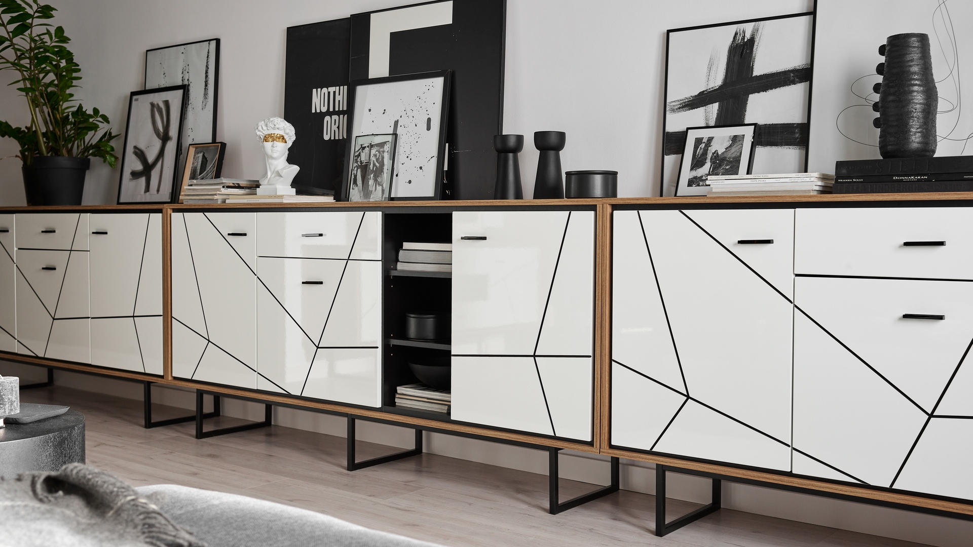 Komoda 3-drzwiowa z szufladą, biały połysk, metalowy stelaż