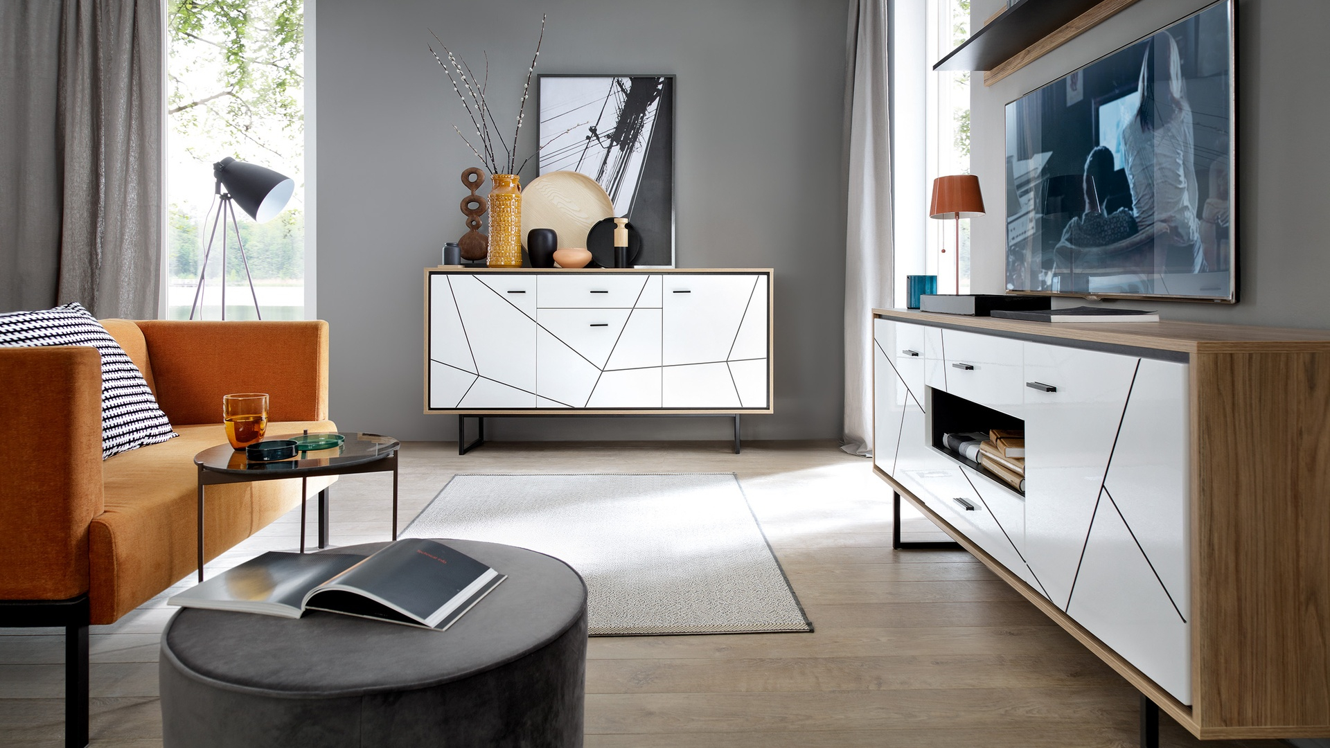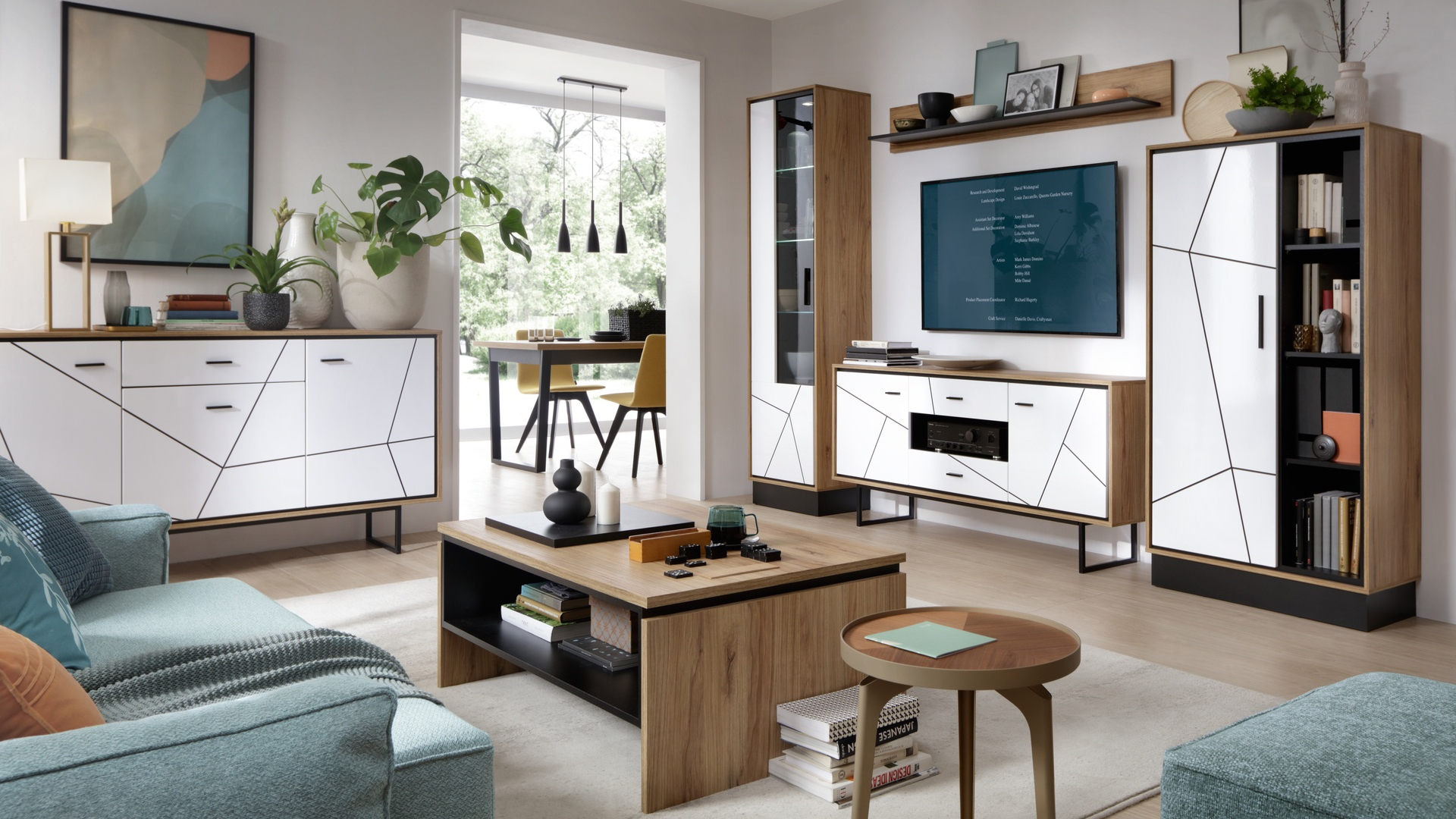 Brolo to propozycja dla osób, które cenią wyrazisty design i przytulny klimat wnętrza. Kolekcja doskonale komponuje się zarówno z odważnym, zielonym tłem, jak i stonowanymi odcieniami szarości. Komoda na metalowym stelażu, stół z synchroniczną prowadnicą oraz opcjonalne oświetlenie LED podkreślają nowoczesny styl mebli i nadają aranżacji elegancki charakter.