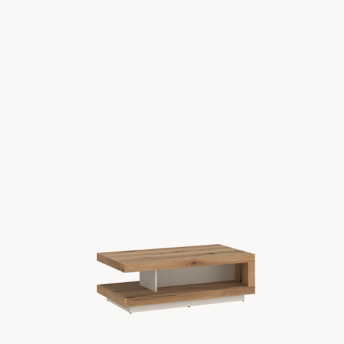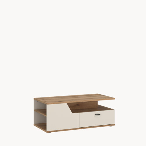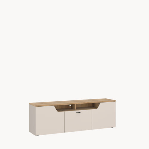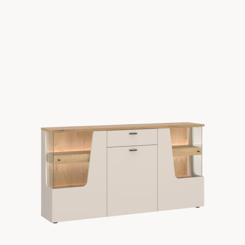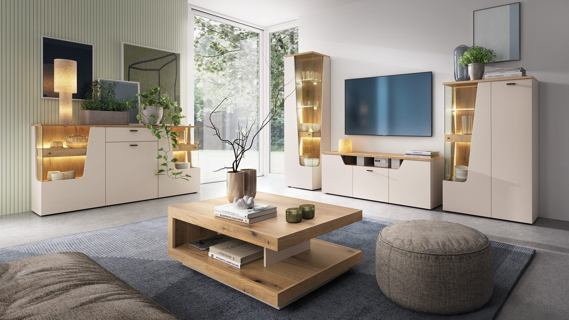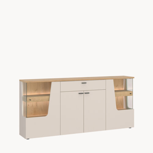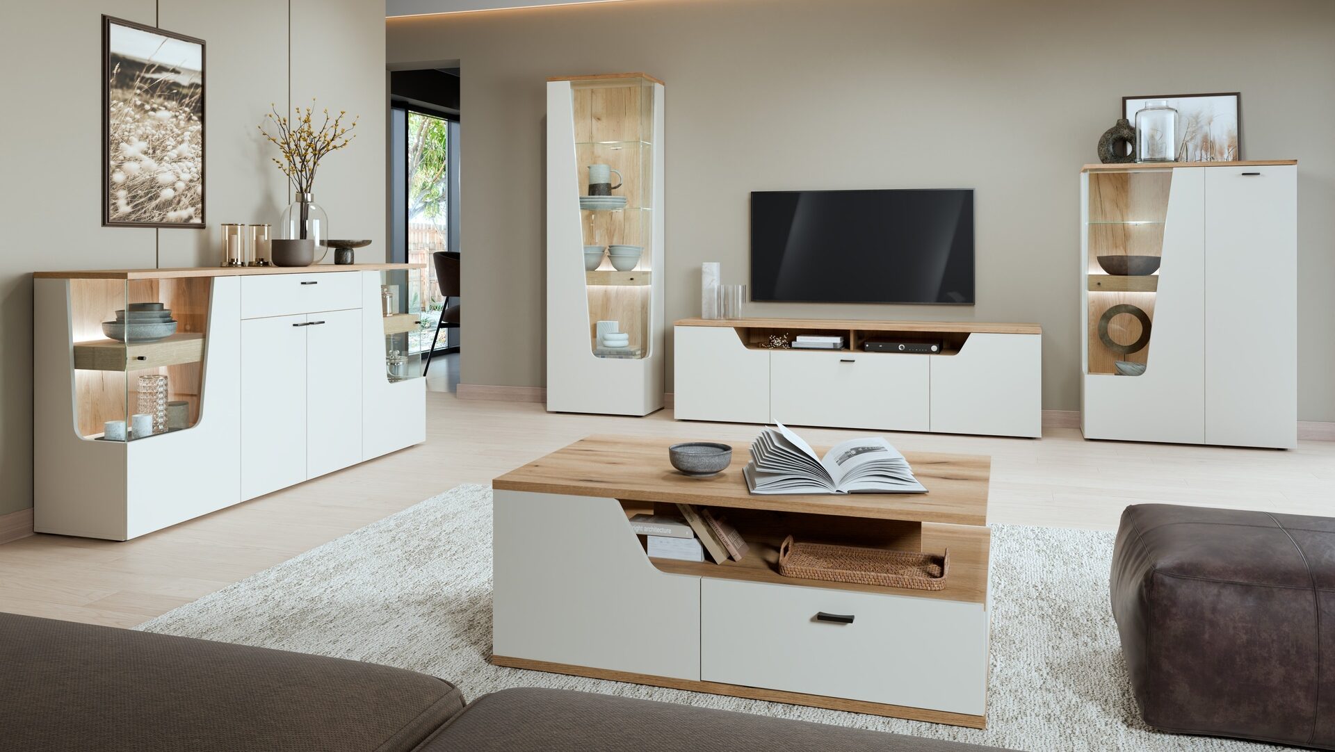 W kolekcji Cut Out matowy kaszmir gra pierwsze skrzypce, ale to jego połączenie z ciepłym dekorem Dąb Coast Evoke oraz przeszkleniami w bokach witryn i komód nadaje meblom wyjątkowego charakteru. Dodatkowe oświetlenie LED (w zestawie) efektownie podkreśla zawartość mebli, tworząc przytulną atmosferę sprzyjającą wspólnym chwilom.