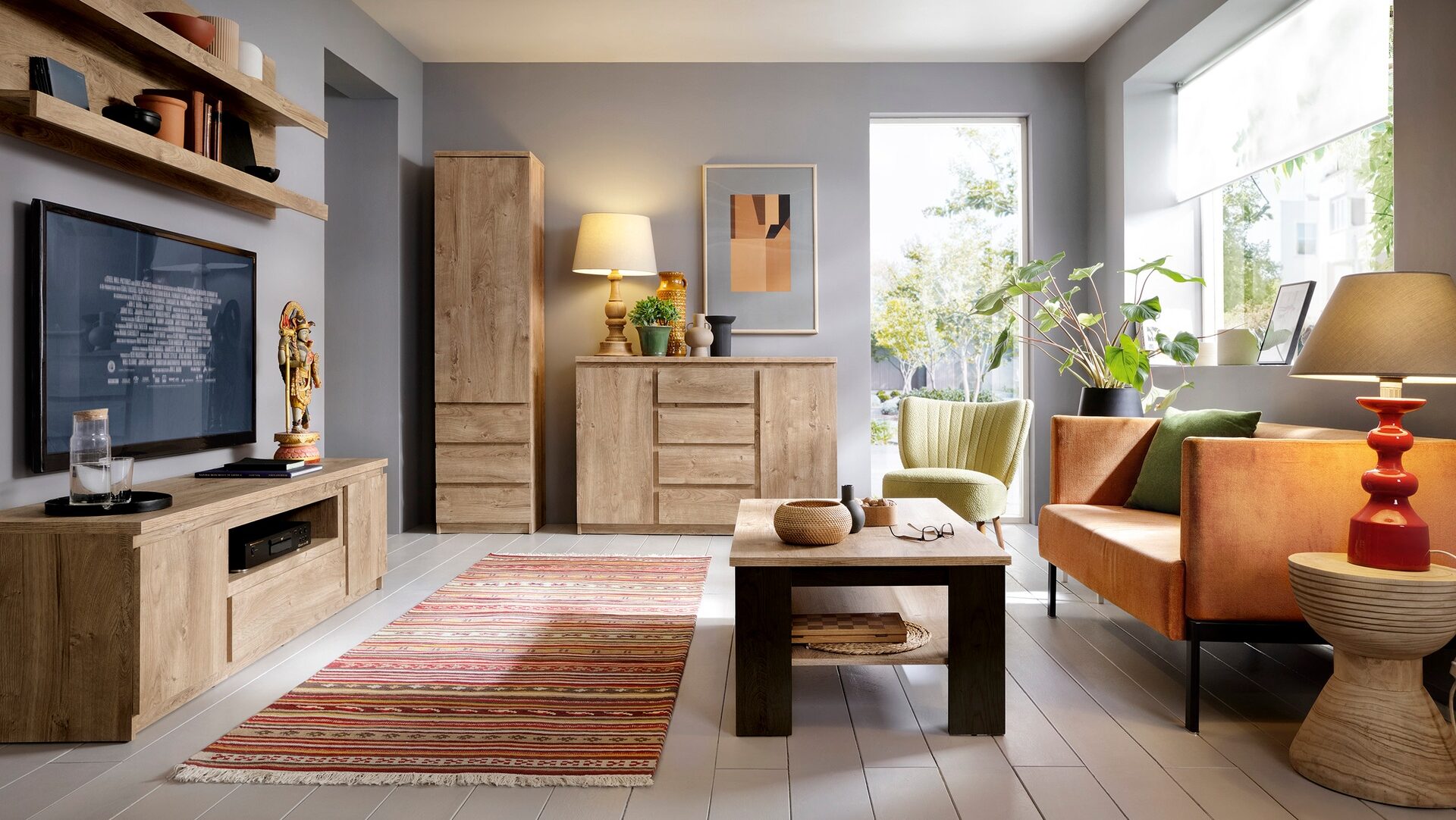 Trendy we wnętrzach przychodzą i odchodzą. Jest jednak coś, co nigdy się nie zmienia - prosta forma i motyw naturalnego drewna. We wnętrzu urządzonym meblami z kolekcji Fribo od progu poczujemy się dobrze, a sprawi to właśnie ciepły odcień dekoru Dąb Ribbeck Złoty. Cechami charakterystycznymi programu są gładkie fronty z lekką strukturą wyczuwalną pod palcami, szuflady z pełnym wysuwem oraz to, że system jest bezuchwytowy. Dla fanów minimalizmu kolekcja dostępna jest też w kolorze białym.