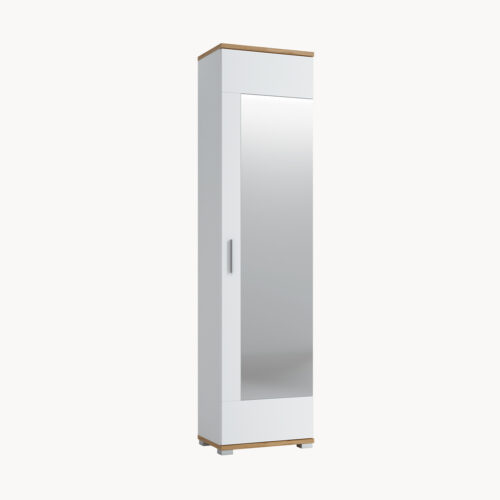 Szafa 1-drzwiowa wąska z lustrem, wysuwany wieszak, półki, biały połysk
