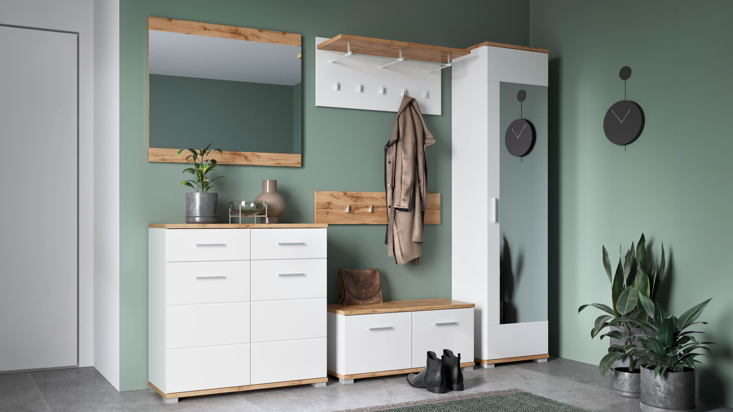 Stylowa kolekcja mebli do przedpokoju Hola jest przykładem efektownych, luksusowo prezentujących się brył, w których nowoczesna prostota idzie w parze z bielą, modnym połyskiem i ponadczasowym wybarwieniem drewna. Stwórz nowoczesny, luksusowo prezentujący się przedpokój z kolekcją Hola. Nawet małe wnętrze zyska niepowtarzalny efekt.