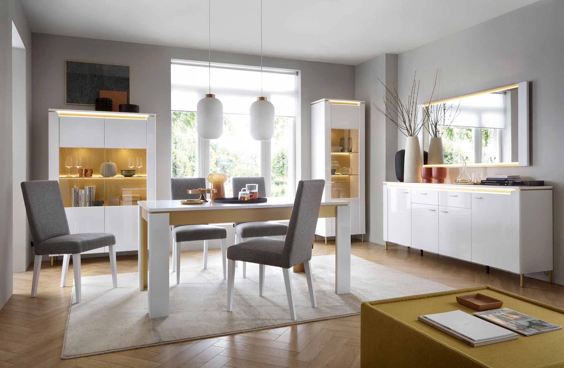 Nowoczesna elegancja, wykreowana poprzez zestawienie matowej i błyszczącej bieli z odcieniem złota i konstrukcyjnym oświetleniem LED tworzy charakter kolekcji Lazio, dedykowanej do jadalni i salonu. Meble, wyposażone w efektowne, złote uchwyty i złote, metalowe nóżki prezentują się lekko i luksusowo. Ich bezkompromisowy szyk pozwala aranżować stylowe, a zarazem funkcjonalne wnętrza, zachwycające nowoczesnością w ponadczasowym wydaniu.