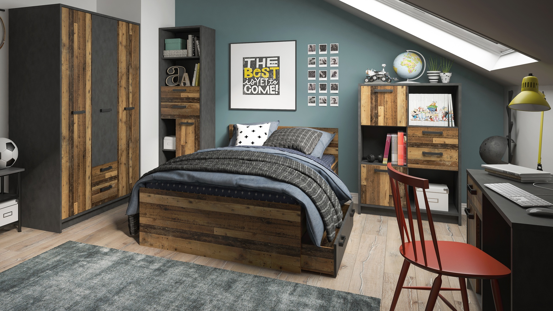 Dekor przypominający recyklingowe drewno zestawiony z imitacją betonu, uchwyty stylizowane na podstarzałe to cechy charakterystyczne kolekcji Nubi, która jest dumnym przedstawicielem stylu industrialnego. Kolekcja jest stworzona z myślą o odważnych nastolatkach, którzy chętnie podążają za trendami.