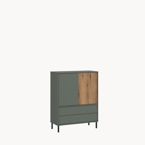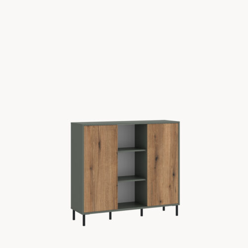 Kolekcja mebli Pozzi łączy elegancję i ponadczasowe kształty z efektownym zestawieniem szarozielonych odcieni i ryflowanych elementów w kolorze dębu. Funkcjonalne bryły na wysokich, metalowych nóżkach oraz nowoczesny mechanizm Push to open czynią ją idealnym wyborem do pokoju młodzieżowego, salonu i jadalni.