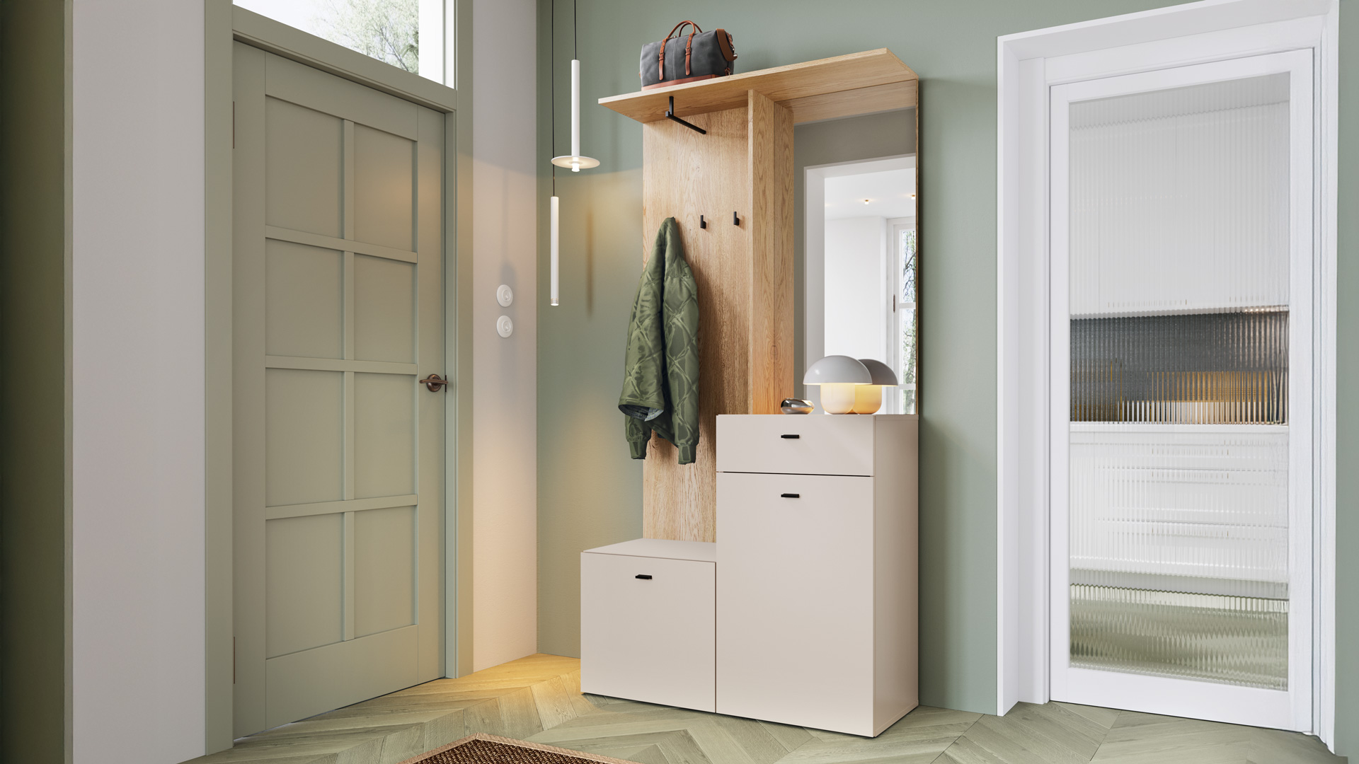 Garderoba ROMEA – elegancki sposób na porządek w przedpokoju, zamknięty w jednej zgrabnej bryle. Lustro, wieszaki, półki i szafki pomieszczą wszystko, czego potrzebujesz przy wyjściu, a połączenie kaszmiru z ciepłym drewnem i czarnymi detalami wprowadzi do wnętrza nowoczesny, skandynawski klimat.