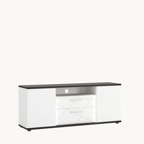 Komoda RTV z 2 drzwiczkami i szufladami, podświetlana, biały połysk, dąb czarny