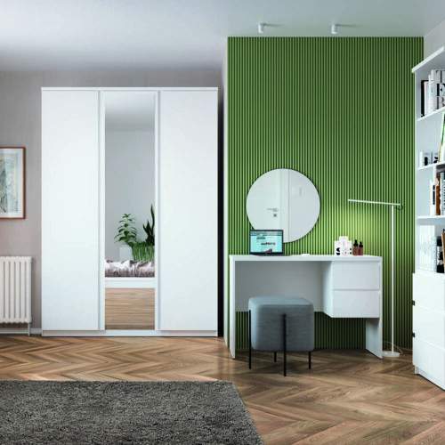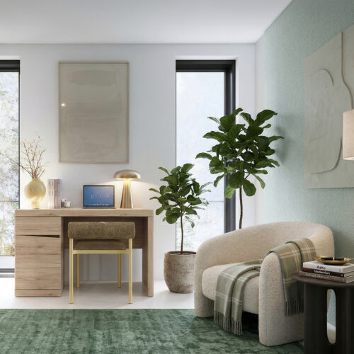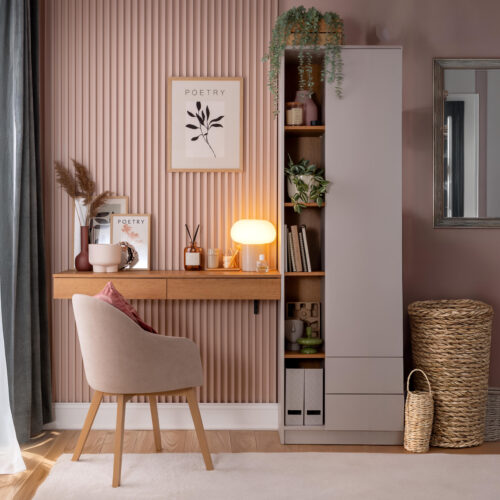 O ile pierwszy warunek może być kłopotliwy, o tyle do zaspokojenia drugiego wystarczy dosłownie kilka podstawowych mebli do biura w domu. Wąskie biurko z szufladami, podwieszana na ścianie półka i może regał lub komoda, gdzie po skończonej pracy można schować najważniejsze rzeczy, chroniąc je przed dziećmi czy domowymi zwierzątkami. I to wszystko! A jeśli chcesz, możesz przywiesić na ścianach dekoracje, dopełniając aranżacji i tworząc prawdziwy „pokój w środku pokoju”.