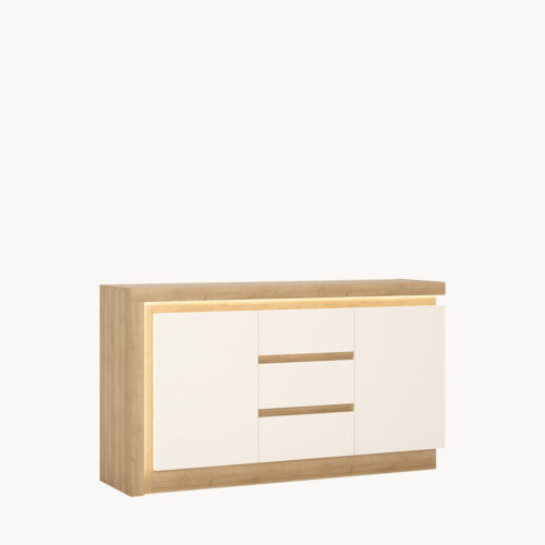 Komoda 2-drzwiowa, 3 szuflady, podświetlana, dekor jasne drewno, biały połysk