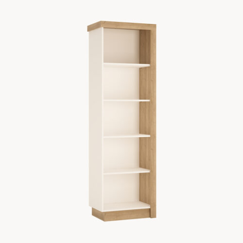 Regał wysoki z półkami, lewostronny, dekor jasne drewno, biały połysk