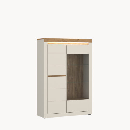 Drugi wariant witryny ma przeszklone mniejsze powierzchnie. Meble takie jak Lyon czy Havana pozwalają zaprezentować mniej, ale uwaga oglądającego jest o wiele bardziej skupiona na konkretnych przedmiotach. Zobaczy dokładnie to, co chcemy i w pełni to doceni.